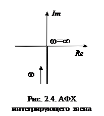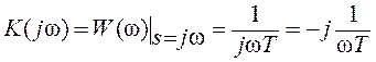 Согласно выражению (2.39) годограф комплексного коэффициента передачи инерционного звена совпадает с отрицательной частью мнимой оси. Когда частота ω = 0 его амплитуда бесконечна, с увеличением частоты она уменьшается и при