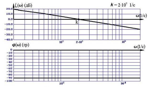 График L = L (w) логарифмической амплитудно-частотной характеристики интегрирующего звена (учитывая логарифмический масштаб по оси w ) представляет собой прямую с наклоном – 20 дБ/дек во всей области частот (0 £ w < ¥), пересекающую ось w на частоте w = k. (Наклон -20 дБ/дек означает, что при увеличении частоты в 10 раз (на декаду) величина L (w) уменьшится на 20 дБ).