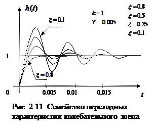 На рис. 2.11 приведены графические изображения временных характеристик, а на рис. 2.12 – семейство кривых для демонстрации влияния коэффициента демпфирования ξ на вид переходных характеристик колебательного звена.