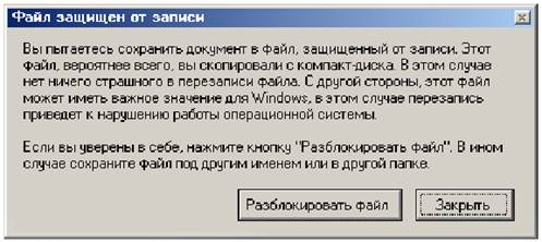 Итак, старое сообщение об ошибке гласило: «Не удается сохранить файл «D:\Только для чтения.doc». Файл с этим именем уже существует и доступен только для чтения. Сохраните файл под другим именем или в другой папке». Это довольно неплохое сообщение, во всяком случае, оно гораздо лучше, чем «Указано неверное число». Но и его можно улучшить. Сначала надо разобраться, в каких случаях оно появляется. Это несложно: оно может появляться, если пользователь попытался сохранить файл на компакт-диске, или же пытается сохранить файл, незадолго перед этим скопировав этот файл с компакт-диска. Случаи, когда файл заблокирован сознательно, в жизни редки, так что их чаще всего можно не учитывать. Главный враг – компакт-диск.