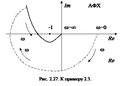 На рис. 2.27 изображена АФХ, построенная в соответствии с данными табл. 2.2. Заданная передаточная функция системы в разомкнутом состоянии содержит три интегрирующих звена. Поэтому видимая часть АФХ дополняется дугой бесконечно большого радиуса, поворачивающую её низкочастотную часть против часовой стрелке на угол, равный 270°. Изображенная на рис. 2.27 характеристика не охватывает точку (-1, 0), (т.е.