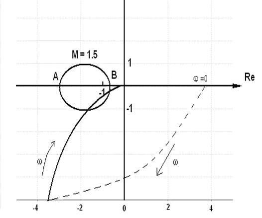 ,0) – концов диаметров окружностей указанных линии постоянного уровня. Область внутри окружности уровня M = 1,5 является запретной зоной по колебательности. График АФХ пересекает эту зону, следовательно, показатель колебательности рассматриваемой системы больше чем 1,5. Действительно, окружность уровня M = 2,5 касается графика АФХ в точке, когда ω = ω m , т.е. M = 2,5. Частота ω m близка к частоте среза ωср.