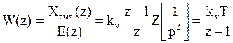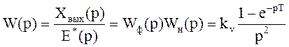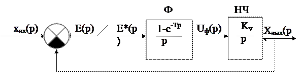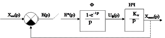 Как видно из рисунка, в прямой цепи системы имеется простейший импульсный элемент (фиксатор) и непрерывная часть (интегрирующее звено). Передаточная функция приведенной непрерывной части: