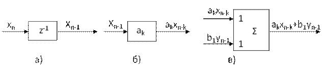а - задержки на период квантования; б - умножения на постоянный коэффициент; в — сложения