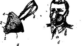 | Рис. 1.Респиратор Р-2: а − общий вид: 1 - фильтрующая полумаска; 2‑выдыхательный клапан с предохранительным «краном»; 3 - два вдыхательных клепана; 4 - носовой зажим; 5 - оголовье; б − респиратор в «боевом» положении. |