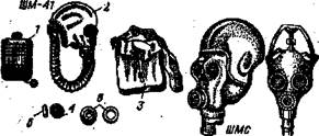Противогаз (рис. 2) состоит из противогазовой коробки и лицевой части. В комплект противогаза входят сумка для противогаза, не запотевающие пленкиили специальный «карандаш» для предохранения от запотевания стекол очков. Зимой противогазы с лицевой частью ШМ-41 и ШМ-41М доукомплектовываются утеплительными манжетами, а лицевые части ММ-1 – вторыми стеклами для очков.