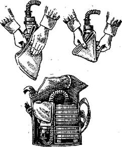 При повреждении соединительной трубки следует задержать дыхание, закрыть глаза, отвинтить соединительную трубку и привинтить противогазовую коробку непосредственно к клапанной коробке, сделать выдох, открыть глаза и возобновить дыхание, придерживая рукой противогазовую коробку (рис. 5, в).