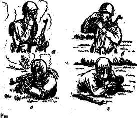 § сдвинуть противогаз немного назад, чтобы при ходьбе он не мешал движению руки;