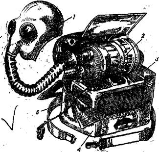 | Рис. 7. Изолирующий противогаз ИП‑4: 1–лицевая часть; 2–регенеративный патрон; 3–каркас; 4–дыхательный мешок; 5–сумка. |