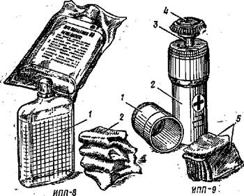 | Рис. 13. Индивидуальные противохимические пакеты: ИПП-8 (1 – сосуд; 2 – ватно-марлевые салфетки); ИПП-9 (1 – крышка; 2 металлический сосуд; 3 –пробойник; 4 – губка; 5 – салфетки). |