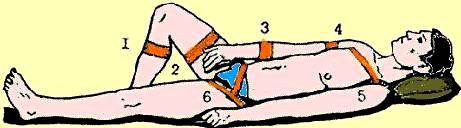 6 − на паховую область при высоком ранении бедра (для этого жгут подводят под конечность и, растягивая, обертывают вокруг нее до прекращения кровотечения).