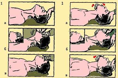 Метод «изо рта в рот» основан на активном вдувании воздуха в легкие пострадавшего (рис. 6/1) и заключается в следующем:
