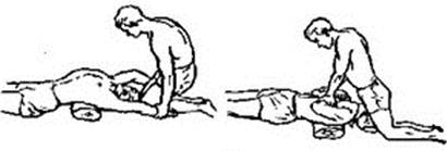 Метод Сильвестра (рис. 7) применяется при невозможности использования вышеописанных методов вследствие утечки воздуха через раненые отверстия лица. Для его проведения пострадавшего укладывают на спину и подложив на уровне лопаток валик из скатанной одежды высотой 15-20 см фиксируют голову в отведенном положении. Реаниматор, став на колени у изголовья пострадавшего и взяв его руки за предплечья, по счету «раз, два, три» разводит их в стороны назад, осуществляя искусственный вдох. По счету «четыре, пять, шесть» делает обратное движение, и, сжимая предплечьями рук пострадавшего нижнюю часть грудной клетки, производит выдох.
