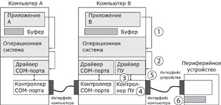 ü ОС компьютера А обращается к драйверу COM-порта, который инициирует работу контроллера.