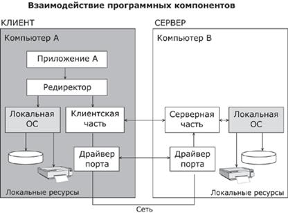Можно представить, что любая программа, которой потребуется печать на "чужом" принтере, должна включать в себя функции, подобные тем, которые выполняет приложение А. Но нагружать этими стандартными действиями каждое приложение — текстовые и графические редакторы, системы управления базами данных и другие приложения — не очень рационально (хотя существует большое количество программ, которые действительно самостоятельно решают все задачи по обмену данными между компьютерами, например Kermit — программа обмена файлами через COM-порты, реализованная для различных ОС, Norton Commander 3.0 с его функцией Link). Гораздо выгоднее создать специальный программный модуль, который (вместо приложения А) будет выполнять формирование сообщений-запросов к удаленной машине и прием результатов для всех приложений. Такой служебный модуль называется клиентом.