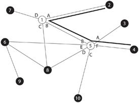 Например, в сети на рис. 5.1 узлы 2 и 4, непосредственно друг с другом не связанные, вынуждены передавать данные через транзитные узлы, в качестве которых могут использоваться, например, узлы 1 и 5. Узел 1 должен выполнить передачу данных с интерфейса A на интерфейс B, а узел 5 — с интерфейса B на F.