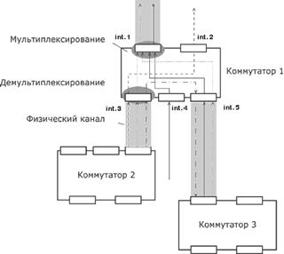 На рис. 5.4 показан фрагмент сети, состоящий из трех коммутаторов. Коммутатор 1 имеет пять сетевых интерфейсов. Рассмотрим, что происходит на интерфейсе 1. Сюда поступают данные с трех интерфейсов — int 3, int.4 и int.5. Все их надо передать в общий физический канал, то есть выполнить операцию мультиплексирования. Мультиплексирование представляет собой способ обеспечения доступности имеющихся физических каналов одновременно для нескольких сеансов связи между абонентами сети.