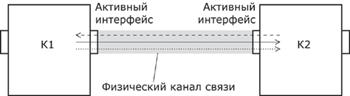 В случае на рис.5.6 коммутаторы К1 и К2 связаны двумя однонаправленными физическими каналами, то есть такими каналами, по которым информация может передаваться только в одном направлении. В этом случае передающий интерфейс является активным, и физическая среда передачи находится целиком и полностью под его управлением. Пассивный интерфейс только принимает данные. Проблемы разделения канала между интерфейсами здесь нет. Заметим, однако, что задача мультиплексирования потоков данных в канале при этом сохраняется. На практике два однонаправленных канала, реализующие в целом дуплексную связь между двумя устройствами, обычно считаются одним дуплексным каналом, а два интерфейса одного устройства рассматриваются как передающая и принимающая части одного и того же интерфейса.