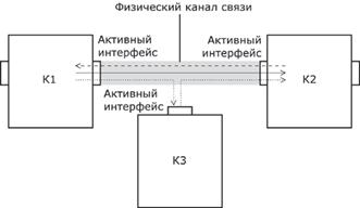 На рисунке 5.7 коммутаторы К1 и К2 связаны каналом, который может передавать данные в обе стороны, но только попеременно. При этом возникает необходимость в механизме согласования доступа интерфейсов К1 и К2 к такому каналу. Обобщением этого варианта является случай, показанный на рис. 5.8, когда к каналу связи подключается несколько (больше двух) интерфейсов, образуя общую шину.