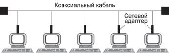 В стандарте Ethernet строго зафиксирована топология электрических связей. Компьютеры подключаются к разделяемой среде в соответствии с типовой структурой " общая шина " (рис. 7.3). С помощью разделяемой во времени шины любые два компьютера могут обмениваться данными. Управление доступом к линии связи осуществляется специальными контроллерами — сетевыми адаптерами - Ethernet. Каждый компьютер, а точнее, каждый сетевой адаптер, имеет уникальный адрес. Передача данных происходит со скоростью 10 Мбит/с. Эта величина является пропускной способностью сети Ethernet.