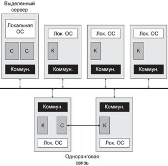 В больших сетях наряду с отношениями клиент-сервер сохраняется необходимость и в одноранговых связях, поэтому такие сети чаще всего строятся по гибридной схеме (рис. 9.7).