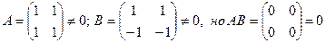 г) Произведение двух ненулевых матриц может равняться нулевой матрице, т.е. из того, что АВ=0 не следует, что А=0 или В=0. Например,