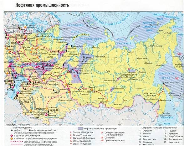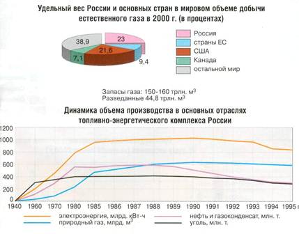 Ведущей подотраслью топливной промышленности в современной России является газовая (до 1990-х годов главной была нефтяная подотрасль, а до нее – угольная). Причины такой ситуации следующие: 1) газ – наиболее экономически эффективное топливо: энергетически ценное и с низкой себестоимостью добычи, его транспортировка по трубопроводам обходится дешевле, чем перевозки твердого или жидкого топлива; 2) Россия имеет огромные запасы природного газа – около трети разведанных мировых запасов. Россия занимает по добыче газа первое место в мире. Около трети добываемого топлива идет на экспорт. Россия поставляет газ в закавказские государства СНГ и многие европейские страны.