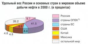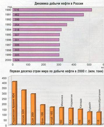 Нефтяная промышленность занимается добычей нефти, ее первичной переработкой и транспортировкой по трубопроводам, а также добычей попутного газа. По добыче нефти Россия занимает второе место в мире после Саудовской Аравии. Примерно 40% добываемой нефти идет на экспорт. Россия обеспечивает нефтью большинство государств СНГ и зарубежной Европы, осуществляются поставки в США, Японию и другие страны.