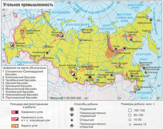 Остальные угольные бассейны России имеют местное значение. Они расположены в основном в восточных регионах страны. Здесь высокая себестоимость добычи часто не очень важна, так как топливо из ведущих бассейнов не может конкурировать с местным из-за отсутствия транспортных путей. В западных регионах России (Урал, Подмосковный бассейн), наоборот, высокая себестоимость привела к резкому сокращению добычи в 1990-е годы, так как местный уголь неконкурентоспособен не только по сравнению с нефтью и газом, но и с более дешевым кузнецким углем. Угольная промышленнось России показана на карте (Рис.).