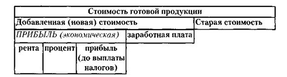 Таким образом, стоимость готового изделия включает в себя стоимость факторов производства (так называемую старую стоимость) и добавленную стоимость (новую). Добавленная стоимость в свою очередь разделяется на заработную плату и, собственно, прибыль.