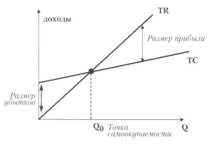 Эффект возрастающей экономии от масштаба можно рассмотреть и на графике, на осях которого будут отложены величина дохода фирмы (производителя) и величину объема выпуска (рис.4.4). Для простоты изобразим совокупные издержки в виде прямой линии (а не кривой, как Вы уже знаете):