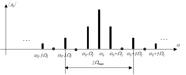 Пусть, например, модулирующий сигнал – последовательность прямоугольных импульсов со скважностью, равной двум. Спектр такого сигнала, как известно, бесконечен и содержит постоянную составляющую (для однополярных импульсов) и бесконечное число нечетных гармоник, т.к. амплитуды гармоник, номера которых кратны скважности, равны нулю (рис. 2.12).