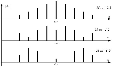 Из приведенных формул видно, что амплитуды спектральных составляющих зависят от МЧМ – индекса частотной модуляции (рис. 2.13).