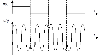 Если первичный модулирующий сигнала представляет собой последовательность однополярных или двуполярных прямоугольных импульсов, что и имеет место на входе дискретного канала, то такой вид модуляции называется манипуляцией. При амплитудной манипуляции модулированный сигнал представляет собой гармоническое колебание с частотой несущей, амплитуда которого в общем случае принимает лишь два значения:
