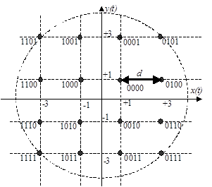 Сигнальное созвездие для случая, когда x(t) и y(t) принимают значения + 1 и + 3 (т.н. четырехуровневая КАМ) приведена на рис. 2.16. Величины + 1 и + 3 определяют уровни модуляции и имеют относительный характер. Созвездие содержит 16 сигнальных точек (КАМ-16), каждая из которых соответствует четырем передаваемым информационным битам.