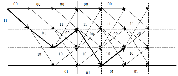, где m - длина кодового ограничения. Конфигурация ребер, соединяющих узлы каждого столбца с узлами столбца справа, одинакова для всего графа. На основании сказанного построим решетчатый граф (рис. 3.3) для кодера, приведенного ранее, условившись, что из двух ребер, выходящих из каждого узла, верхнее соответствует входному символу 0, нижнее – 1.