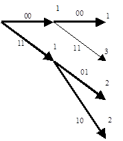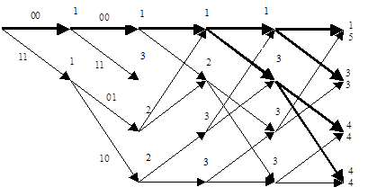 | 1) принимаемый кадр n0 символов – 10. Декодер выберет оба пути и определит метрику каждого из них – цифра над узлом; |