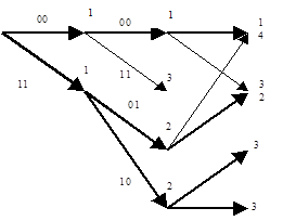 Другой способ описания связей между входной и выходной последовательностями сверточного кодера состоит в использовании кодового дерева, в котором каждая вершина соответствует очередному входному символу, а на ребре, ведущем к этой вершине, записывается соответствующая совокупность выходных символов. Таким образом, каждая входная последовательность задает некоторый путь на дереве, а совокупности символов, соответствующие ребрам, составляющим этот путь, образуют выходную последовательность. Ясно, что при росте длины входной последовательности число возможных путей растет экспоненциально, так что использование такого дерева не очень удобно.