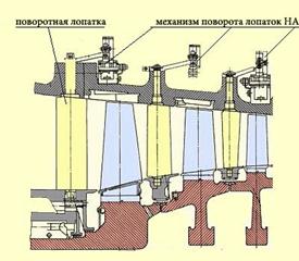 Т.к. рабочий диапазон вращения ротора таких двигателей не велик, порядка 90-100%, то нет необходимости усложнять двигатель. 90% это как правило режим земного малого газа. В полёте частота вращения ротора постоянно 100%. Это делается из-за условия приёмистости двигателя. Т.к. винт очень массивен, и быстро раскрутить его до нужного режима не представляется возможным, то обороты двигателя сделали постоянными 100%, а режим работа задаётся рычагом УПРТ (управление положением рычага топлива). При даче газа подача топлива увеличивается при постоянных оборотах, а лопасти винта переставляются на больший угол атаки(винт догружается) за минимальное время. Для повышения газодинамической устойчивости турбореактивных двигателей и увеличения рабочего диапазона частот вращения, одних клапанов перепуска мало, применяют также поворотные лопатки В.Н.А.(входного направляющего аппарата), а также многовальную схему. Разберём вначале поворотные лопатки В.Н.А.