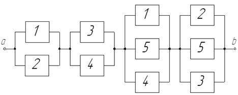 Набор элементов образует минимальный путь, если исключение любого элемента из набора приводит к отказу пути. Из этого вытекает, что в пределах одного пути элементы находятся в основном соединении, а сами пути включаются параллельно. Так, для рассмотренной мостиковой схемы (см. рис.14) набор минимальных путей представлен на рис.17.