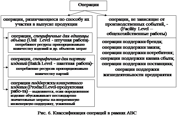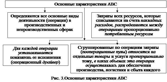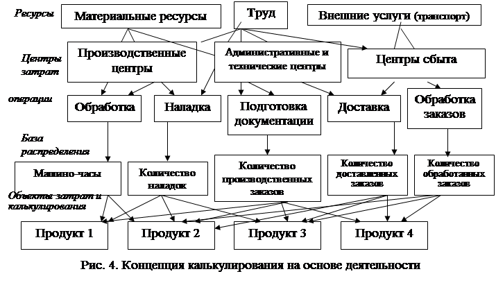 Приведенные характеристики свидетельствуют о том, что в отличие от традиционной системы калькулирования, построенной по принципу «продукция потребляет ресурсы», АВС предусматривает, что продукция потребляет производственные процессы (операции), а процессы потребляют определенные ресурсы (рис.4).