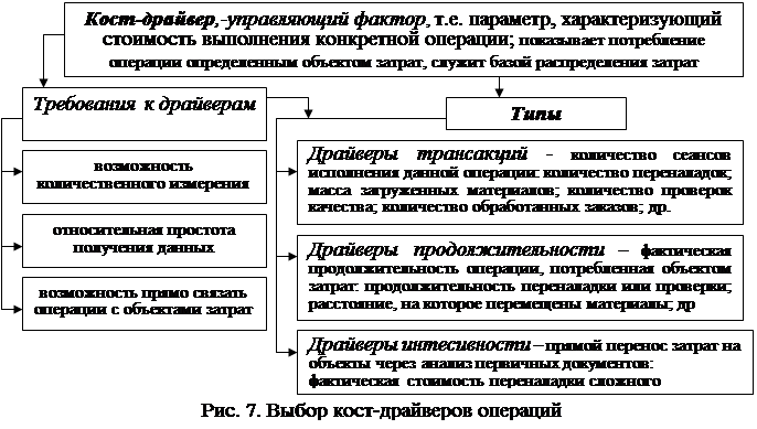 Все ресурсы, затраченные на рабочую операцию, составляют ее стоимость. Для того, чтобы все работы предприятия были точно соотнесены с необходимыми для их выполнения ресурсами, изучается взаимосвязь между определенными видами затрат и их носителями (кост-драйверами) (рис.7 и таблица 1).