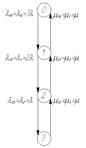 Из нулевого состояния (все устройства исправны) возможен переход в состояние 1, когда одно устройство отказало и отправлено в ремонт, а два других исправны. Интенсивность перехода будет
