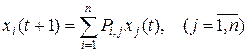 При учете случайных законов изменения параметров работоспособность оценивается с помощью вероятностных характеристик. Подобное представление модели ОД не противоречит принципам, которые положены в основу построения алгоритмов определения работоспособности САУ и поиска дефекта при представлении процедур диагностики марковскими процессами, поскольку будущее состояние системы действительно может определяться предыдущим состоянием. В любом случае существует вероятность того, что система, находящаяся в состоянии j в момент времени t перейдет в состояние i в момент времени t+Δt. Если рассматривать дискретный марковский процесс и характеризовать поведение системы n -мерным вектором с составляющими Рij, определяющими вероятность нахождения системы в момент времени t в состоянии j, то поведение системы в момент времени t+1 может быть найдено из решения системы уравнений вида
