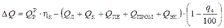 К.п.д. котла характеризует полезно использованную теплоту q1 и учитывает потери теплоты с дымом q2, химический и механический недожеги топлива q3 и q4, потери в окружающую среду q5 и с теплотой шлака q6: