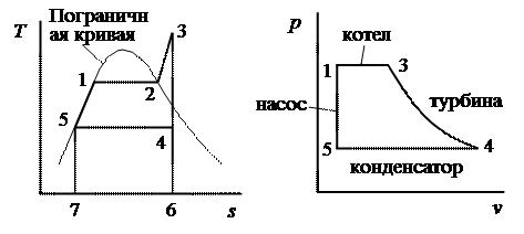 Цикл Ренкина реализуется следующим образом: в паровом котле происходит испарение воды; в пароперегревателе – перегрев пара при постоянном давлении; в паровой турбине пар адиабатно расширяется, совершая работу; в конденсаторе – конденсируется при постоянном давлении; конденсат подается насосом в экономайзер, где он подогревается, а затем в котел, где испаряется. К.п.д. цикла Ренкина с сухим насыщенным паром составляет 29-36 %, а с перегретым паром – 34-46 %.