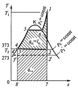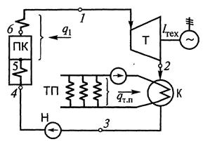 ПК – паровой котел; Т – паровая турбина; К – конденсатор-подогреватель; Н – насос; ТП – тепловой потребитель. Цифры соответствуют точкам цикла в Т–s-диаграмме