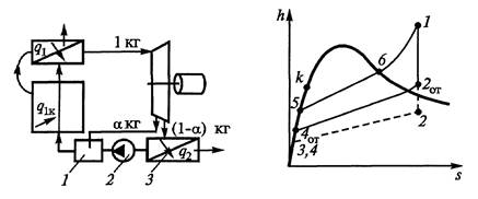 В подогреватель 1 направляется часть пара, обозначаемая через α. Тогда через остальные ступени турбины и конденсатор 3 пройдет остальная часть, равная 1 – α. Отбор пара производится при достаточно высоких еще параметрах р2ОТ, t2ОТ и h2ОТ, и это позволяет так подогреть подаваемый насосом 2 конденсат, что энтальпия его увеличивается до величины h4ОТ. Обычно количество отбираемого пара определяют из условия, что за счет его теплоты конденсат нагреется до той же температуры, с какой конденсируется этот пар (t4ОТ = tН, h4ОТ = h" при р = р2ОТ). Записав уравнение теплового баланса (теплота, отданная паром, равна теплоте, полученной конденсатом)