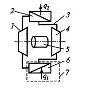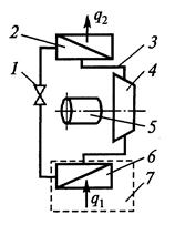 Основными агрегатами такой холодильной установки являются сидящие на одном валу с электродвигателем 5 компрессор 1, детандер (расширительная машина) 4 и два теплообменника 2 и 6, один из которых расположен в охлаждаемом помещении 7 и забирает из него теплоту q1, а другой – его называют холодильником – в окружающей среде, куда он и отдает теплоту q2. Все агрегаты соединены трубами 3 и образуют герметичную систему, в которой циркулирует рабочее тело.