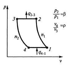 Для идеализированного цикла (n1 = n2 = k) q1-2 и q3-4 равны нулю, и, считая воздух идеальным газом с постоянной теплоемкостью, найдем
